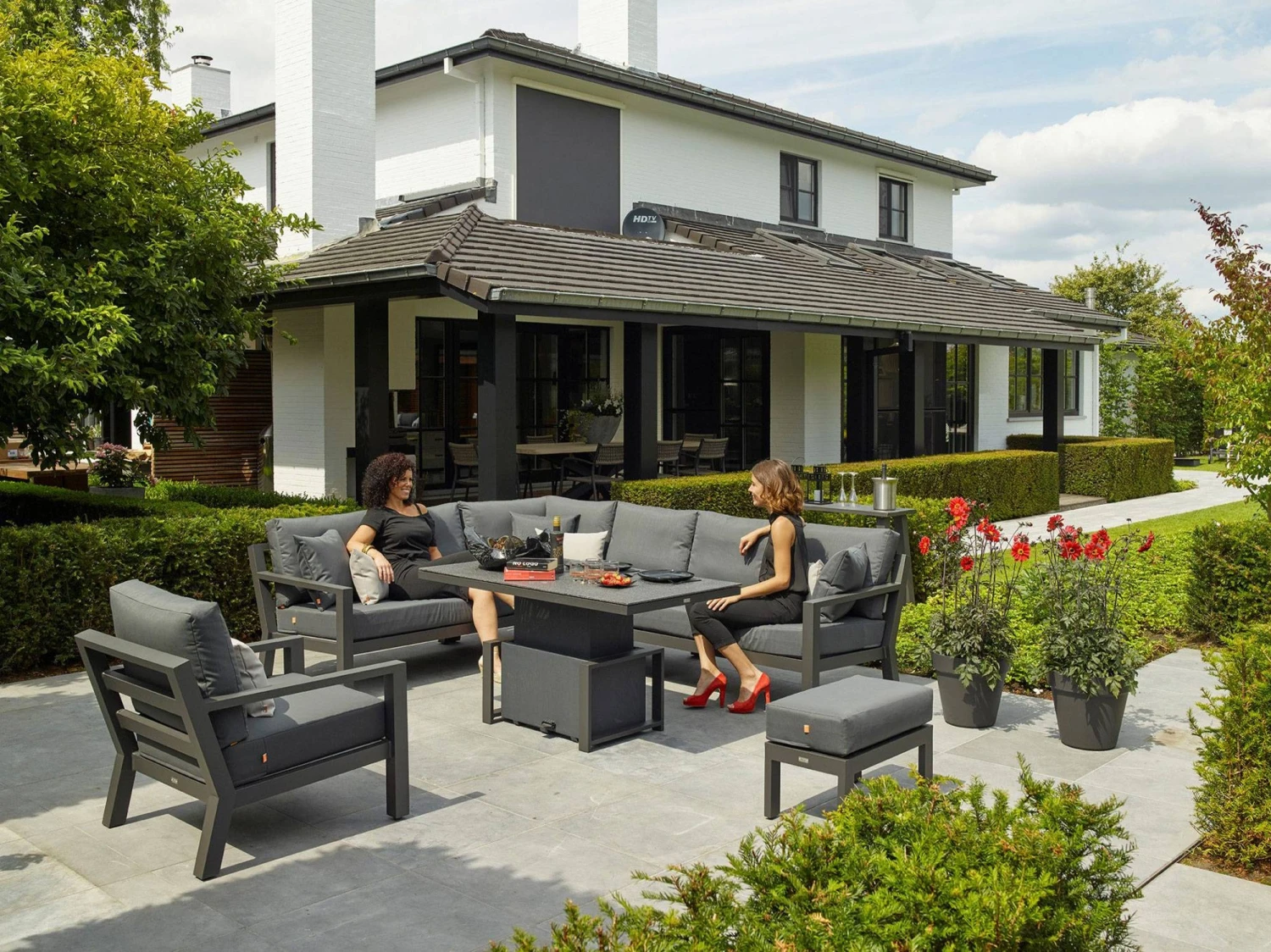 The frame is aluminium in a lava colour finished perfectly with carbon coloured all weather cushions. The great thing about LIFE cushions is their All-Weather technology. This is a cushion that can be left outdoors throughout the entire season. The cushions are produced from high-quality synthetic products; when it rains the water goes through the cushion cover and into the inner cushion. By pressing down on the cushion or placing the cushions on their sides, the cushions will be dry in a relatively short period of time.